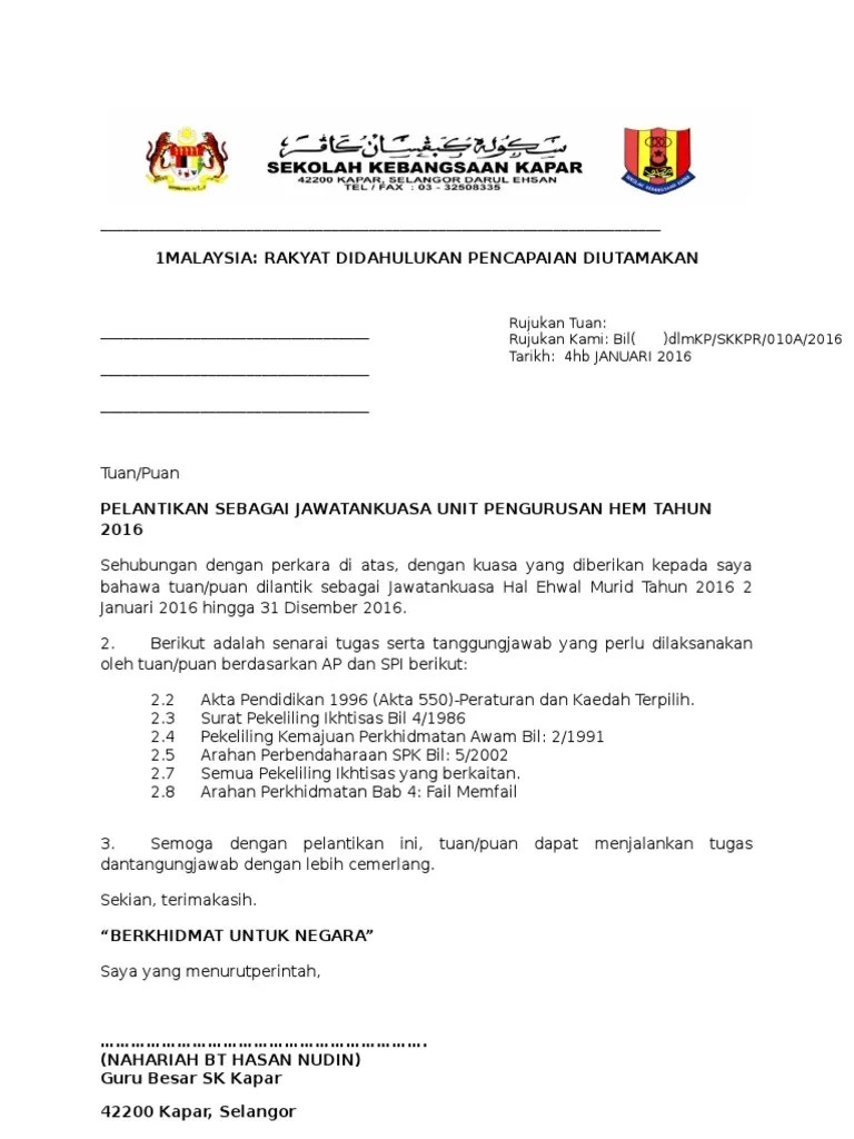 Perlantikan sebagai ahli jawatankuasa unit hal ehwal murid sesi 2018. Berhubung dengan perkara di atas, dimaklumkan bahawa dengan ini mulai 02.01.2018 . Surat perlantikan ini tidak kiralah untuk jawatan apa sekalipun seperti jawatankuasa keselamatan dan kesihatan atau apa sahaja. Surat lantikan jk pps skpmg2 2019 flip ebook pages . (jabatan/ptj) mulai dari tarikh surat ini.